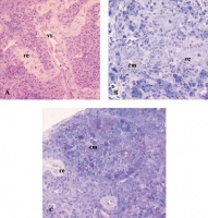 Figura 6.–Secciones histológicas del tegumento de S. Senegalensis. A. Piel de la porción cefálica donde se distingue la epidermis (e), la dermis (d) y la capa de la melanina ( ) en la dermis (x10 ...