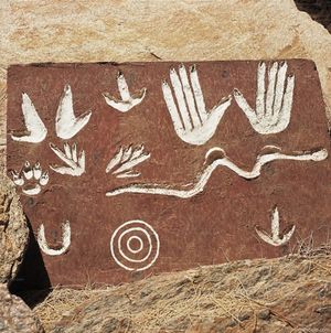 Artes literarias, escénicas y visuales de las islas del Océano Pacífico en Oceanía, incluidas Australia, Polinesia, Melanesia y Micronesia.Pintura simbólica aborígen. Arte de Oceanía. Pintura rupestre ...